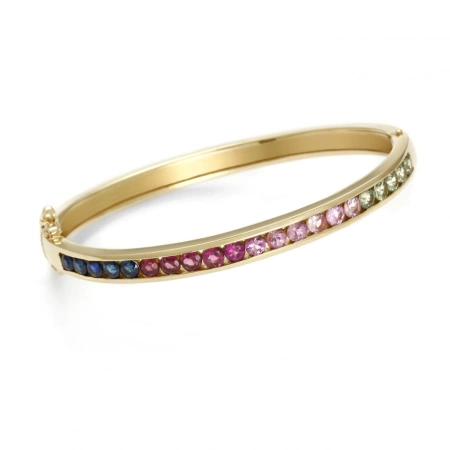 Odkryj niezwykłe połączenie kolorów i blasku w naszej złotej bransoletce z szafirami multikolor i rodolitami. To elegancki i wyrafinowany dodatek, który może być noszony na każdą okazję, dodając szyku każdej stylizacji.