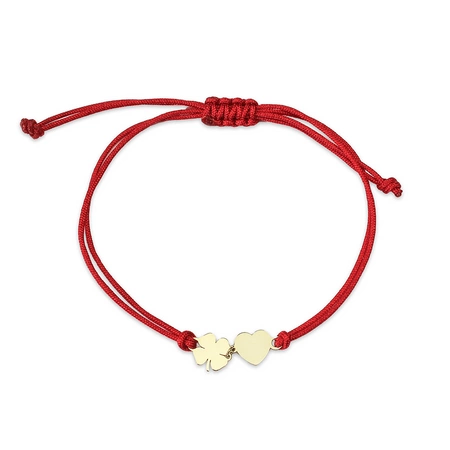Bransoletka złota na sznurku Au 585 - serce i koniczynka