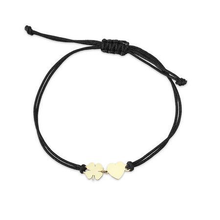 Bransoletka złota na sznurku Au 585 - serce i koniczynka