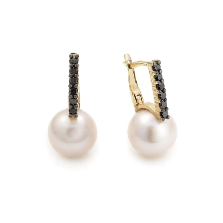 Kolczyki z czarnymi brylantami i perłą to połączenie wyrazistego kontrastu i subtelnej elegancji. Czarne brylanty, iskrzące jak gwiazdy, harmonijnie współgrają z delikatnym połyskiem perły. Złote oprawy doskonale otaczają te kamienie, tworząc biżuterię o wyjątkowym charakterze. Kolczyki te są doskonałym wyborem na wieczorowe wyjścia czy specjalne okazje, emanując jednocześnie siłą i delikatnością noszącej je kobiety. Kolczyki wykonane ze złota próby 585.