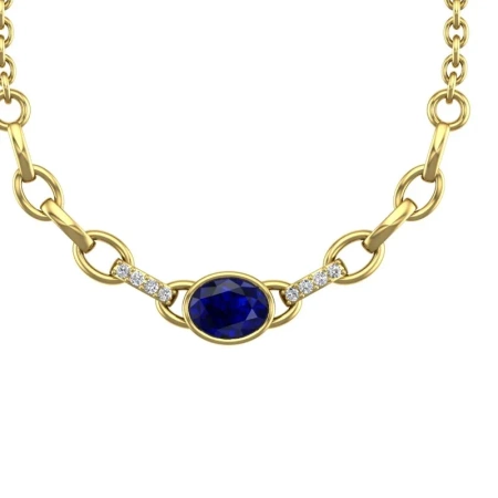 Wykonana z wysokiej jakości złota próby 585, ta złota kolia zachwyca swoją nowoczesną formą. Składa się z połączonych ze sobą owalnych ogniw, z których centralne zdobione jest owalnym szafirem otoczonym lśniącymi brylantami.
