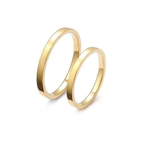 Obrączki złote ze zdjęcia są wykonane z żółtego złota o próbie 585. Mają szerokość 2 mm i są gładkie. Obrączki mają gładką powierzchnię wewnątrz, co zapewnia komfort noszenia. Żółte złoto to klasyczny wybór dla obrączek ślubnych. Jest trwałe i odporne na korozję.