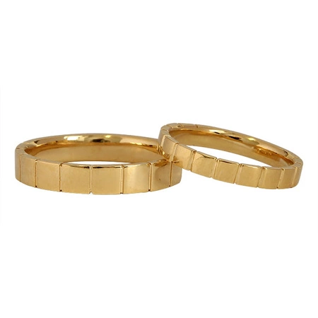 Złote prążkowane obrączki to nieklasyczne obrączki ślubne. Męska obrączka ma szerokość 4 mm, a damska 3 mm. Obie obrączki są wykonane z żółtego złota próby 585.
