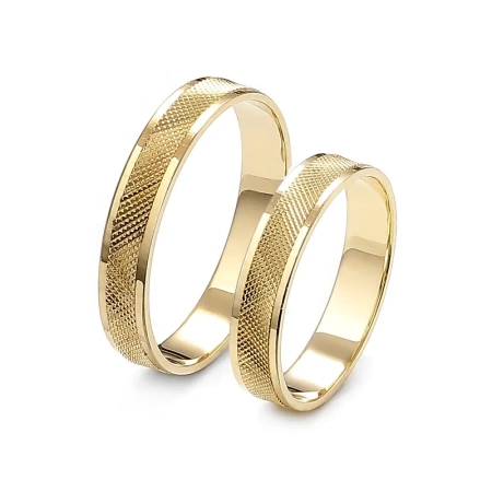 Obrączki ślubne złote, które zachwycają swoją delikatnością i wyrafinowanym wzornictwem. Wykonane z lśniącego złota o szerokości 4 mm, te obrączki są idealnym wyborem dla par, które cenią sobie subtelność i elegancję. Obrączka damska wyróżnia się gładką powierzchnią, która symbolizuje harmonię i spokój. Jej minimalistyczny design jest doskonały dla kobiet, które pragną nosić coś wyjątkowego, ale niezwykle wygodnego. Obrączka męska, choć również o gładkim wykończeniu, posiada subtelny wzór, który dodaje jej charakteru. To idealny wybór dla mężczyzn, którzy doceniają prostotę, ale nie chcą rezygnować z elegancji. Ta para obrączek to doskonałe połączenie klasyki i nowoczesności, idealne dla par, które pragną uczcić swój ślub wyjątkowymi symbolami miłości. Obrączki ślubne wykonane ze złota próby 585.
