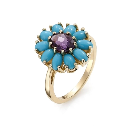 Dodaj odrobinę koloru i symboliki do swojej kolekcji biżuterii lub podaruj wyjątkowy prezent bliskiej osobie. Zamów już dziś złoty pierścionek (próba 585) z ametystem i turkusem i ciesz się jego niepowtarzalnym pięknem.