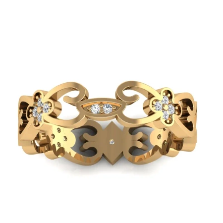 Pierścionek został wykonany z żółtego złota w próbie 585, jest ozdobiony 21 brylantami o łącznej masie 0,16 ct.