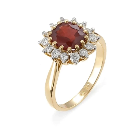 Pierścionek został wykonany z żółtego złota w próbie 585, jest ozdobiony 14 brylantami o łącznej masie 0,52 ct H-I/SI oraz rubinem o masie około 1,82 ct.