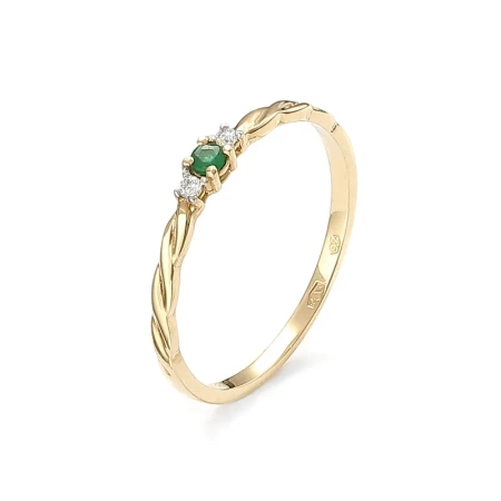 Pierścionek został wykonany z żółtego złota w próbie 585, jest ozdobiony 2 brylantami o łącznej masie około 0,03 ct oraz szmaragdem o masie około 0,03 ct.