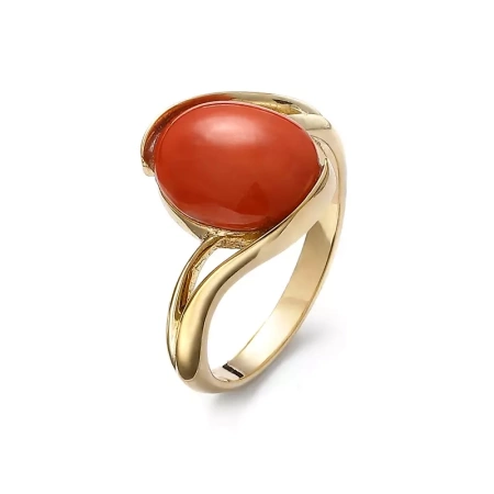 Koral otacza misterna, złota oprawa, która podkreśla jego piękno i dodaje pierścionkowi wyrafinowanego wyglądu.