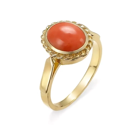 Koral otacza misterna, złota oprawa, która podkreśla jego piękno i dodaje pierścionkowi wyrafinowanego wyglądu.