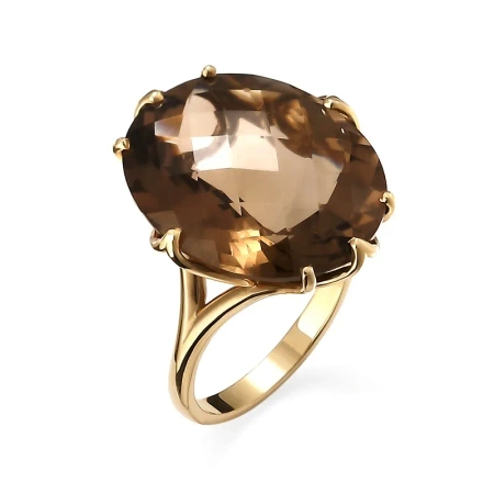Kwarc dymny otacza misterna, złota oprawa, która podkreśla jego piękno i dodaje pierścionkowi wyrafinowanego wyglądu.