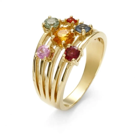 Pierścionek zdobią różnorodne szafiry, mieniące się w odcieniach różu, żółci, zieleni i niebieskiego, a także głęboko rubinowe rodolity. Każdy kamień został starannie osadzony w złotej oprawie, tworząc harmonijną i efektowną kompozycję.