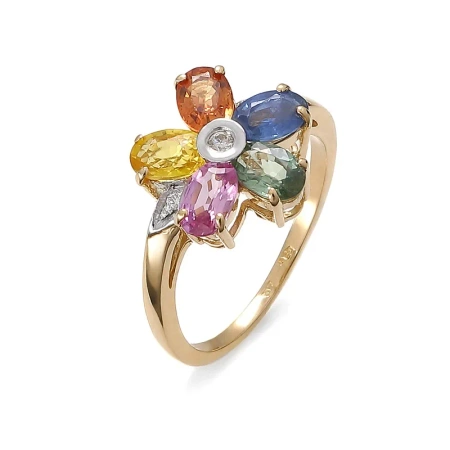 Złoty pierścionek z szafirami mix i brylantami – tęcza barw w królewskim wydaniu