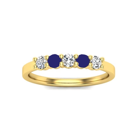 Pierścionek został wykonany z żółtego złota w próbie 585, jest ozdobiony 3 szafirami o łącznej masie 0,40 ct.5 oraz 2 brylantami o łącznej masie 0,20 ct.