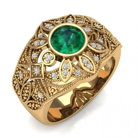 Centralnym punktem kompozycji jest szmaragd o intensywnym zielonym kolorze, osadzony w ozdobnej oprawie. Ten szlachetny kamień, symbolizujący miłość, nadzieję i spokój, dodaje pierścionkowi wyjątkowego charakteru.
