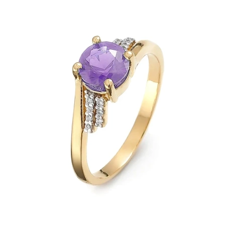 Centralnym punktem kompozycji jest tanzanit o intensywnym fioletowym kolorze, osadzony w ozdobnej oprawie. Ten szlachetny kamień, symbolizujący mądrość i duchową harmonię, dodaje pierścionkowi wyjątkowego charakteru.