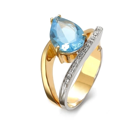 Złoty pierścionek z topazem i brylantami – nowoczesna elegancja w kropli błękitu