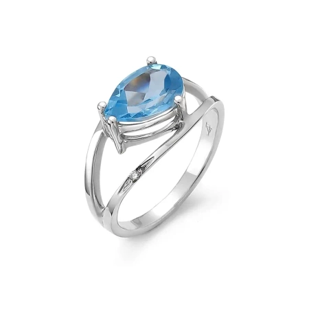 Centralnym punktem kompozycji jest topaz o jasnoniebieskiej barwie, osadzony w kształcie kropli. Ten szlachetny kamień, symbolizujący mądrość i wierność, dodaje pierścionkowi wyjątkowego charakteru.