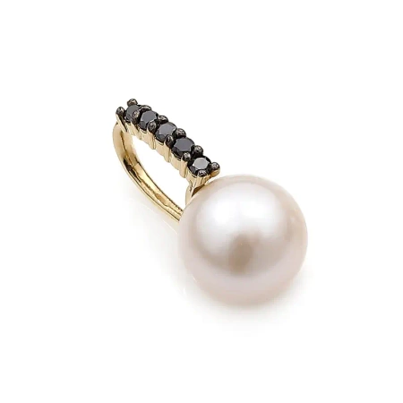 Blask perły został podkreślony przez lśniące brylanty, które dodają zawieszce niezrównanego blasku i elegancji. Połączenie perły, czarnych brylantów i szlachetnego złota tworzy harmonijną kompozycję, która przyciąga wzrok.