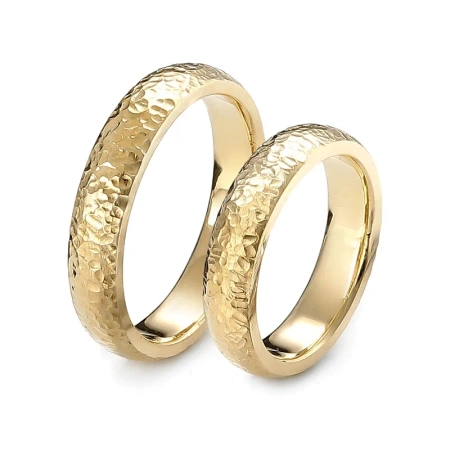 Obrączki są wykonane z żółtego złota o próbie 585 i mają szerokość 4,5 mm. Mają powierzchnię zewnętrzną ozdobioną delikatnym rysunkiem w formie młoteczkowania. Rysunek nadaje obrączkom elegancki i nowoczesny wygląd. Żółte złoto to klasyczny wybór dla obrączek ślubnych. Jest trwałe i odporne na korozję.