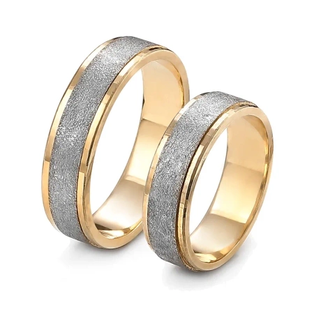 Obrączki złote są wykonane z dwukolorowego złota o próbie 585, są szerokości 5,5 mm. Mają matowe wykończenie, które nadaje im elegancki i nowoczesny wygląd. Matowe wykończenie sprawia, że obrączki są mniej błyszczące niż obrączki o polerowanym wykończeniu. Nadaje im to bardziej stonowany i wyrafinowany wygląd. Szerokość 5,5 mm to szerokość, która jest jednocześnie klasyczna i nowoczesna. Obrączki o tej szerokości są eleganckie i subtelne, ale jednocześnie nie są zbyt cienkie. Obrączki ślubne wykonane ze złota próby 585.