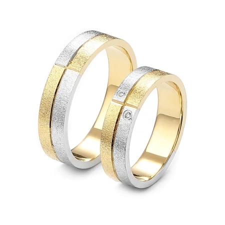 Obrączki ślubne złote, które są kwintesencją elegancji i wyrafinowania. Wykonane z lśniącego złota o szerokości 5 mm, te obrączki są symbolem trwałej miłości i zaangażowania. Obrączka damska jest prawdziwym dziełem sztuki jubilerskiej, zdobiona 2 brylantami o łącznej masie 0,02 ct. Te drogocenne kamienie są nie tylko symbolem niezachwianej miłości, ale także dodają blasku i luksusu, sprawiając, że każdy gest ręki staje się okazją do prezentacji ich piękna. Obrączka męska, z jej gładką i polerowaną powierzchnią, odzwierciedla klasyczną męskość i siłę. Jej prostota i elegancja czynią ją idealnym wyborem dla nowoczesnego mężczyzny, który ceni sobie wygodę i styl. Ta para obrączek to doskonały wybór dla par, które pragną uczcić swój ślub wyjątkowymi symbolami swojej miłości. Obrączki ślubne wykonane ze złota próby 585.