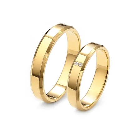 Obrączki mają szerokość 4 mm i wykonane są z żółtego złota. Mają fazowany profil, który dodaje im elegancji i szyku. Obrączka damska jest oprawiona w 2 brylanty o łącznej masie 0,02 ct. Brylanty są umieszczone w okrągłych oprawach, które nadają im nowoczesny i stylowy wygląd. Obrączki są wygodne w noszeniu i będą służyć przez wiele lat. Fazowany profil dodaje im elegancji i szyku. Brylanty dodają im blasku i wyjątkowości. Obrączki ślubne wykonane ze złota próby 585.