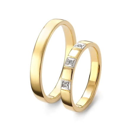 Obrączki mają półpłaski profil, który dodaje im elegancji i szyku. Mają szerokość 3 mm. Obrączka damska jest oprawiona w 3 brylanty o łącznej masie 0,02 ct. Brylanty są umieszczone w kwadratowych oprawach, które nadają im nowoczesny i stylowy wygląd.