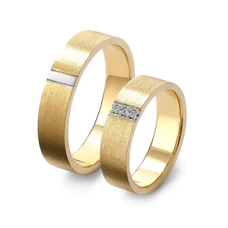 Obrączki wykonane są z najwyższej jakości złota, co gwarantuje ich trwałość i ponadczasowy blask. Szerokość każdej obrączki wynosi 5 mm, co jest idealnym rozmiarem zarówno dla elegancji, jak i komfortu noszenia. Obrączka damska wyróżnia się dodatkowo dzięki 3 brylantom o łącznej masie 0,02 ct, które są misternie osadzone w złocie. Te drogocenne kamienie są symbolem czystości i niezłomności, które są tak ważne w małżeństwie. Design obrączek łączy w sobie klasyczną elegancję z nowoczesnym akcentem, co sprawia, że są one wyjątkowe i niepowtarzalne. Obrączki ślubne wykonane ze złota próby 585.