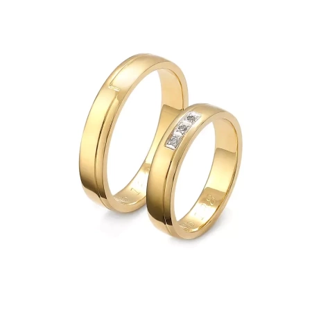 Złote obrączki ślubne o szerokości 4 mm. Obrączka damska jest wyjątkowo elegancka, gdyż posiada 3 brylanty o masie 0,03 ct, które są symbolem trwałości i czystości uczucia. Kamienie te są osadzone w sposób, który pozwala im pięknie połyskiwać przy każdym ruchu dłoni. Obrączki te, dzięki swojej subtelnemu wyglądowi i klasycznej formie, będą wspaniałym przypomnieniem o dniu ślubu i miłości, która połączyła dwoje ludzi. Ich ponadczasowy design sprawia, że będą one pasować do każdego stylu i okazji, będąc jednocześnie wyrafinowanym dodatkiem do ślubnej stylizacji. Obrączki te są nie tylko pięknym elementem biżuterii, ale także trwałym symbolem miłości i oddania. Obrączki ślubne wykonane ze złota próby 585.