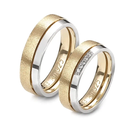 Złote Obrączki Ślubne o szerokości 5 mm. Obrączka damska to połączenie klasycznej elegancji i nowoczesnego designu. Wykonana z lśniącego złota o szerokości 5 mm, ta obrączka jest ozdobiona 5 brylantami o łącznej masie 0,04 ct. Każdy z kamieni został starannie osadzony, tworząc niepowtarzalny wzór, który przyciąga wzrok i podkreśla piękno dłoni. Obrączka męska, utrzymana w tej samej szerokości co damska, charakteryzuje się prostotą i elegancją. Solidne wykonanie z tego samego szlachetnego złota co obrączka damska, symbolizuje siłę i trwałość związku. Ten zestaw obrączek to doskonałe połączenie tradycji z nowoczesnością. Obrączki ślubne wykonane ze złota próby 585.