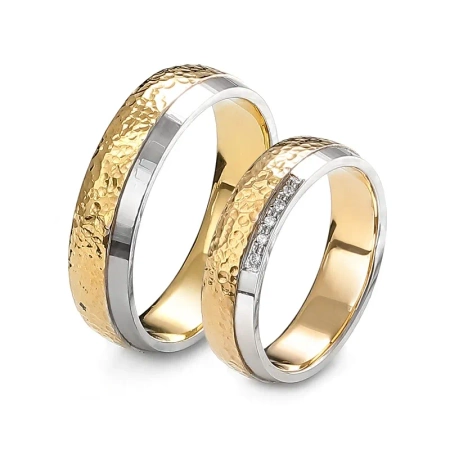Eleganckie Obrączki Ślubne Złote o szerokości 5,5 mm. Obrączka damska to wyrafinowany wybór dla nowoczesnej panny młodej. Wykonana z lśniącego złota o szerokości 5,5 mm, ta obrączka jest ozdobiona 5 brylantami o łącznej masie 0,05 ct, które są symbolem trwałości i czystości uczucia. Każdy z kamieni został starannie osadzony, tworząc niepowtarzalny wzór, który przyciąga wzrok i podkreśla piękno dłoni. Obrączka męska, utrzymana w tej samej szerokości co damska, charakteryzuje się prostotą i elegancją. Solidne wykonanie z tego samego szlachetnego złota co obrączka damska, symbolizuje siłę i trwałość związku. Obrączki ślubne wykonane ze złota próby 585.