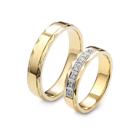 Ścięte boki nadają obrączkom nowoczesny i elegancki wygląd. Są również wygodne w noszeniu, ponieważ nie uciska palców. Obrączki o szerokości 4 mm są eleganckie i subtelne, ale jednocześnie mają bardziej masywny wygląd. Złoto to klasyczny wybór dla obrączek ślubnych. Jest trwałe i odporne na korozję. Brylanty dodają obrączkom elegancji i blasku. W tym przypadku obrączki mają 7 brylantów o masie 0,07 ct.