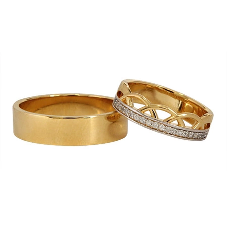 Złote obrączki z brylantami to nieklasyczne obrączki ślubne. Obrączki są wykonane z żółtego złota próby 585, damska obrączka jest szerokości 5 mm, natomiast męska 6mm. Męska obrączka jest płaska, ale na powierzchni obrączki damskiej znajduje się delikatny wzór. Wzór ten nadaje obrączce wyrazisty, ale nienachalny charakter.Obrączki ślubne wykonane ze złota próby 585.