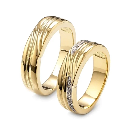 Obrączki ślubne złote mają szerokość 5,5 mm, co nadaje im delikatność i elegancję. Obrączka ślubna damska jest ozdobiona 16 brylantami o łącznej masie 0,16 ct. Brylanty są równomiernie rozmieszczone wokół obrączki, tworząc przepiękną koronę, która symbolizuje trwałość i blask wspólnego życia. Każdy brylant jest starannie osadzony, co świadczy o wysokiej jakości wykonania i dbałości o detale. To wyjątkowe połączenie tradycji i nowoczesności, które będzie pięknym przypomnieniem o dniu ślubu przez wiele lat. Obrączki ślubne wykonane ze złota próby 585.