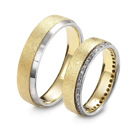 Obrączki ślubne złote, które łączą w sobie prostotę i wyrafinowanie. Obrączka męska o szerokości 5 mm zachwyca swoją klasyczną formą i subtelnym połyskiem, będąc doskonałym symbolem trwałej miłości. Obrączka damska, również o szerokości 5 mm, została dodatkowo ozdobiona 49 brylantami o łącznej masie 0,25 ct, co nadaje jej wyjątkowego blasku. Każdy kamień jest precyzyjnie osadzony, tworząc niepowtarzalny efekt, który przyciąga spojrzenia i podkreśla piękno chwili. Obrączki ślubne wykonane ze złota próby 585.