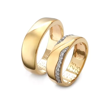 Obrączki ślubne wykonane ze złota o szerokości 6,5 mm, co zapewnia imponujący wygląd, jednocześnie zachowując elegancję i subtelność. Obrączka damska jest wyjątkowo okazała, gdyż posiada aż 18 brylantów o łącznej masie 0,25 ct, co nadaje jej wyjątkowy blask i prestiż. Brylanty są osadzone w sposób, który pozwala im pięknie połyskiwać i mienić się przy każdym ruchu dłoni, co sprawia, że są one nie tylko symbolem miłości i zaangażowania, ale także prawdziwym dziełem sztuki jubilerskiej. Ich ponadczasowy design i precyzyjne wykonanie sprawiają, że będą one wspaniałym przypomnieniem o dniu ślubu i miłości, która połączyła dwoje ludzi, przez wiele lat. Obrączki ślubne wykonane ze złota próby 585.