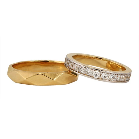 Złote obrączki z brylantami to nieklasyczne obrączki ślubne. Są wykonane z żółtego złota próby 585. Obrączka damska ma szerokość 4 mm, natomiast męska 3,5 mm. Damska obrączka jest oprawiona w 14 brylantów o łącznej masie 0,63 ct.
