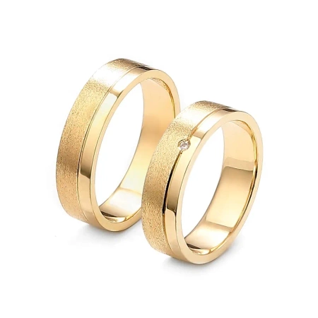 Obrączki mają szerokość 5 mm i płaski profil. Mają matowe wykończenie, które dodaje im elegancji i szyku. Gładka linia po jednej stronie dodaje im nowoczesnego charakteru. Obrączka damska jest oprawiona w jeden brylant o masie 0,01 ct. Brylant jest umieszczony w okrągłej oprawie.