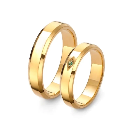 Obrączki ślubne wykonane ze złota. Obrączka damska jest ozdobiona małym, wyjątkowo pięknym szmaragdem, symbolizującym zjednoczenie dwóch dusz w małżeństwie. Obrączki mają szerokość 4 mm, a szmaragd na obrączce damskiej ma łączną masę 0,01 ct. Jest to elegancki wybór, który będzie pięknie prezentował się na dłoni nowożeńców. Obrączki ślubne wykonane ze złota próby 585. Obrączki ślubne wykonane ze złota próby 585.