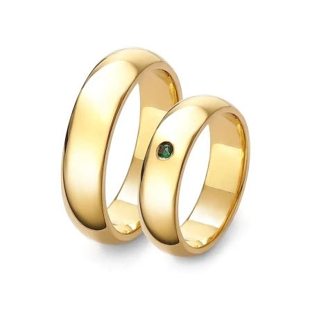 Obrączki ślubne wykonane z lśniącego złota. Obrączka damska jest wyjątkowo elegancka, z delikatnie oprawionym szmaragdem o masie 0,02 ct, który dodaje jej wyjątkowego charakteru. Szmaragd, będący symbolem wierności i miłości, pięknie komponuje się z ciepłym blaskiem złota. Obrączki mają szerokość 5 mm, co czyni je wyraźnym, ale zarazem subtelnym symbolem związku małżeńskiego. Ich klasyczny design sprawia, że są one ponadczasowym wyborem. Obrączki ślubne wykonane ze złota próby 585.