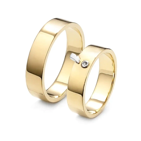 Obrączki złote to eleganckie obrączki wykonane z żółtego złota. Mają one szerokość 5 mm i płaski profil. Obrączka męska jest gładka, natomiast obrączka damska jest oprawiona jednym brylantem o masie 0,02 ct. Brylant jest umieszczony w okrągłej oprawie. Obrączki są wygodne w noszeniu i będą służyć przez wiele lat. Są wykonane z wysokiej jakości materiałów i wykonane z precyzją.