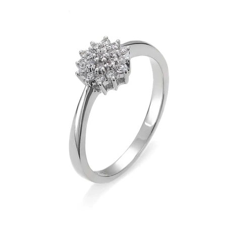 Pierścionek zaręczynowy został wykonany z białego złota w próbie 585, jest ozdobiony 19 brylantami o łącznej masie 0,16ct H-I/SI.